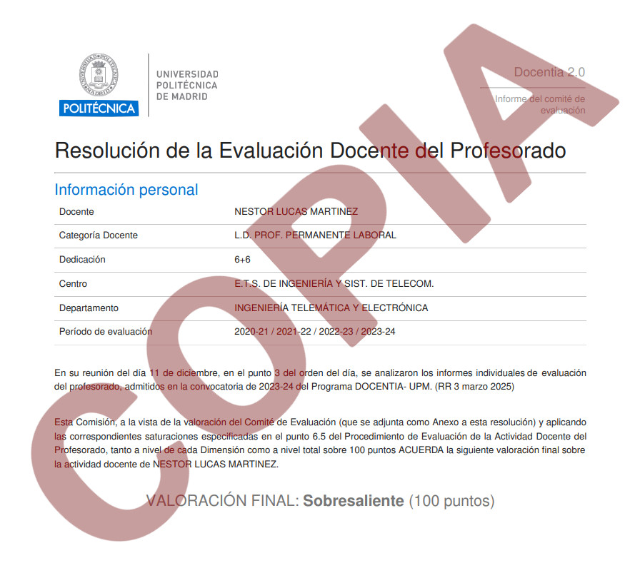 On December 18, 2025, I received the results of my evaluation under the DOCENTIA 2.0 program at Universidad Politécnica de Madrid (UPM). DOCENTIA is a national program promoted by ANECA that provides universities with a framework to design and implement their own model for evaluating the quality of university teaching.